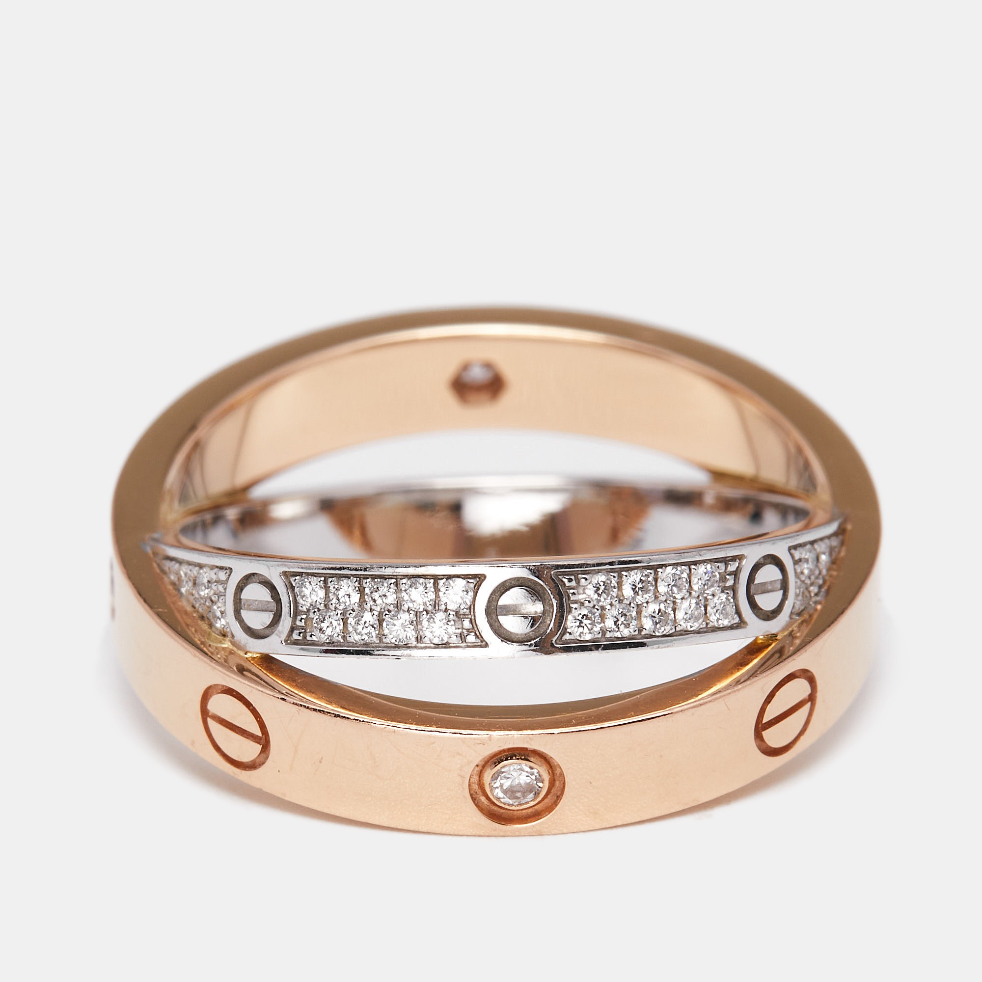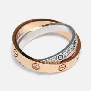 The Cartier LOVE Ring in two-tone 18K gold is a bold yet refined statement of commitment and style. Featuring a double-band design, this ring elegantly intertwines yellow and white gold, creating a striking contrast that enhances its contemporary allure.