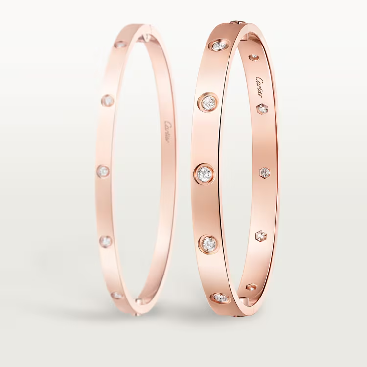 The Cartier LOVE bracelet, classic model, is an enduring emblem of eternal love. Defined by the signature screw motif, the design symbolizes a bond meant to last forever, enhanced with 10 diamonds for subtle brilliance and sophistication.