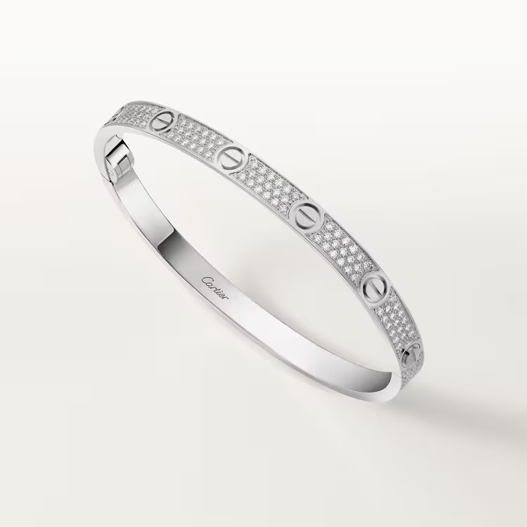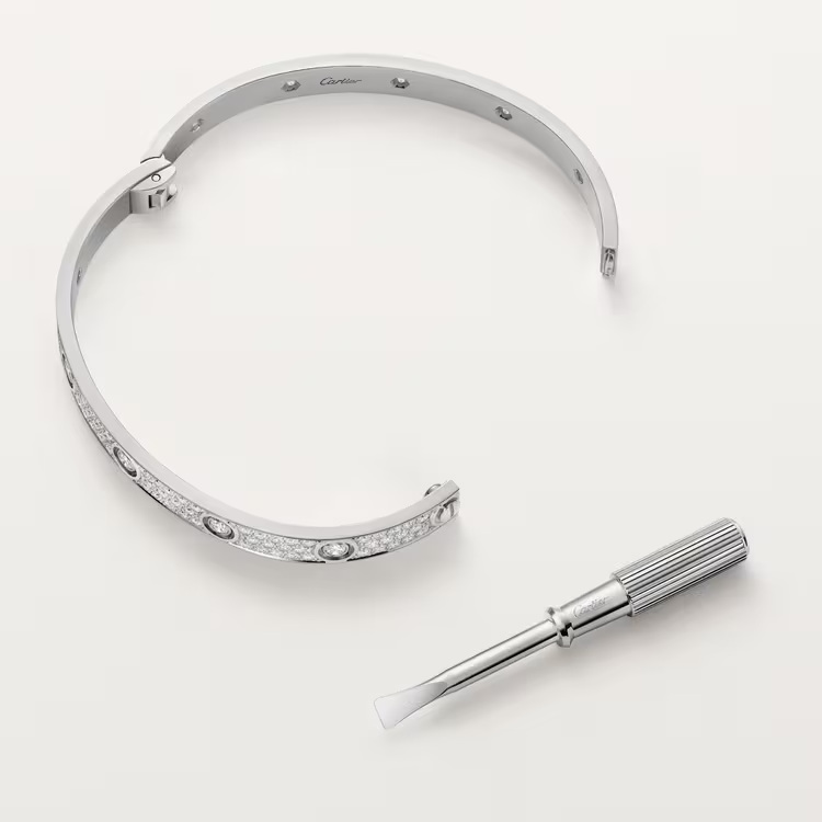 The Cartier LOVE bracelet, medium model, is a contemporary interpretation of the Maison’s iconic symbol of everlasting love. Defined by the signature screw motif, the pavé design adds subtle brilliance while preserving the bracelet’s bold, clean lines.