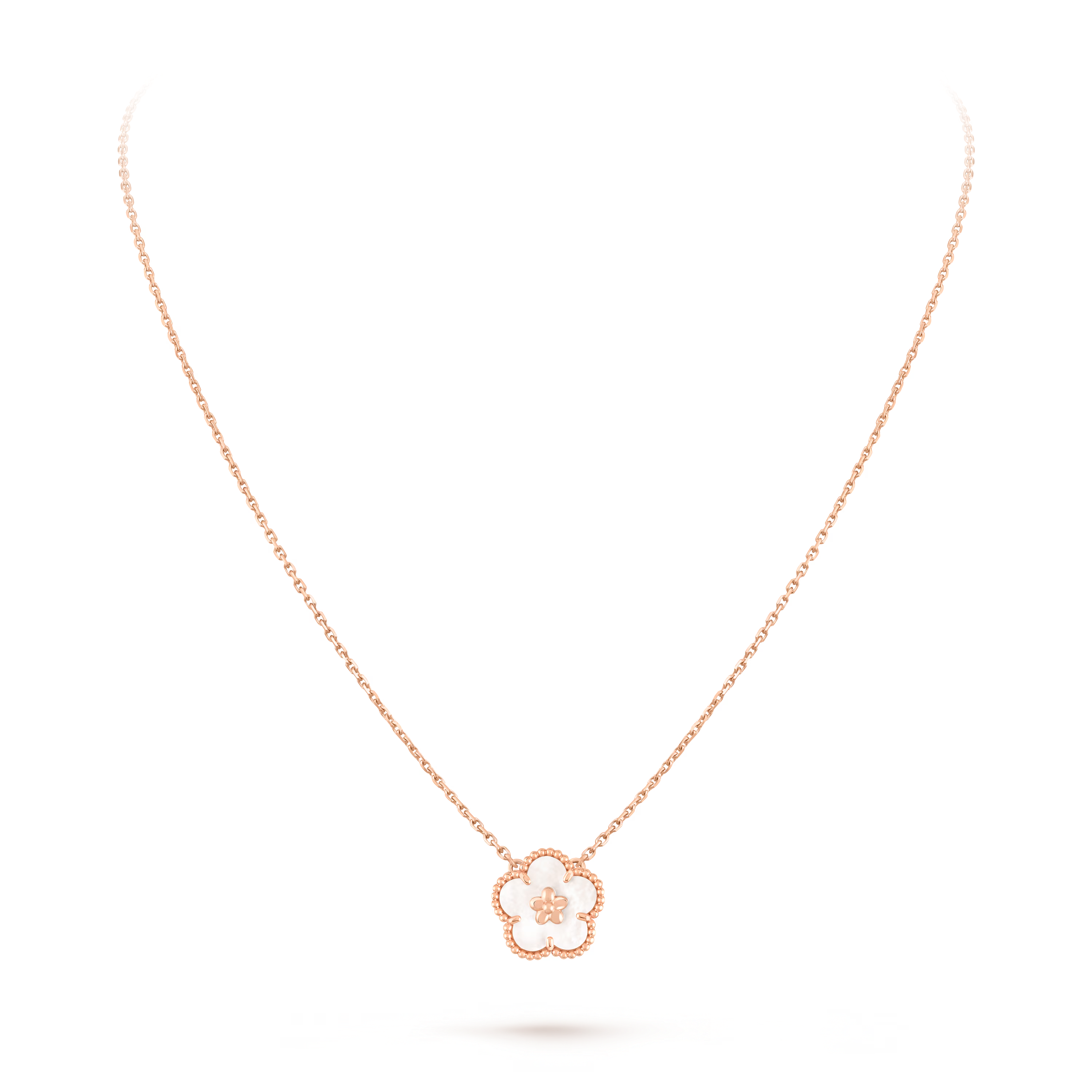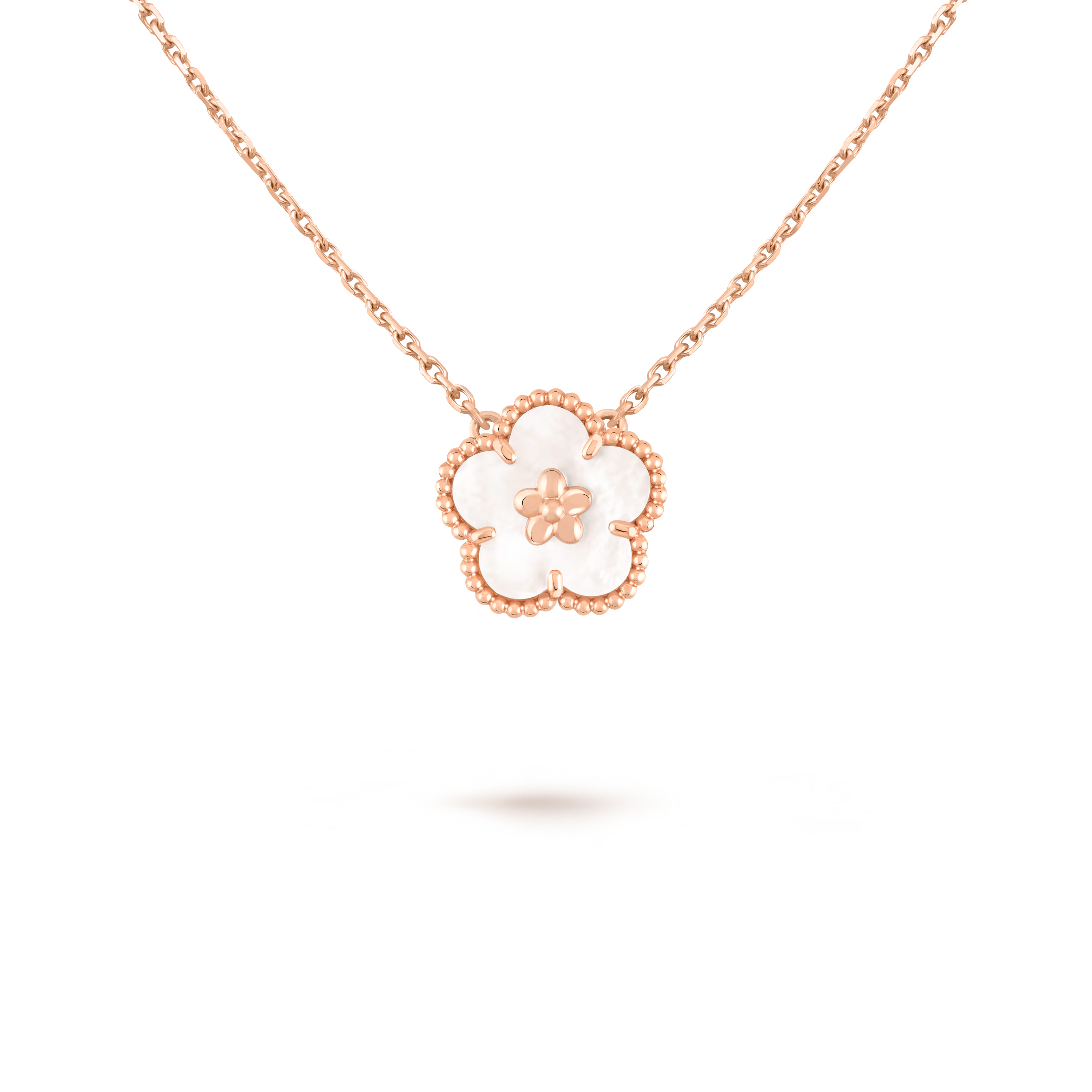 Delicate, joyful, and imbued with poetic charm, the Lucky Spring Pendant celebrates Van Cleef & Arpels’ inspired vision of nature and renewal. Crafted in warm 18K rose gold, this pendant features the Maison’s signature plum blossom motif, elegantly adorned with luminous mother-of-pearl.