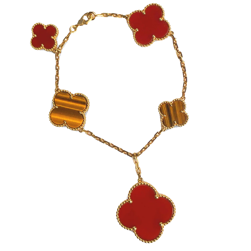 The Magic Alhambra bracelet reinterprets the Maison’s iconic four-leaf motif through a harmonious play of contrasting sizes. With five motifs arranged in an elegant asymmetric sequence, the piece expresses freedom, movement, and refined imagination.