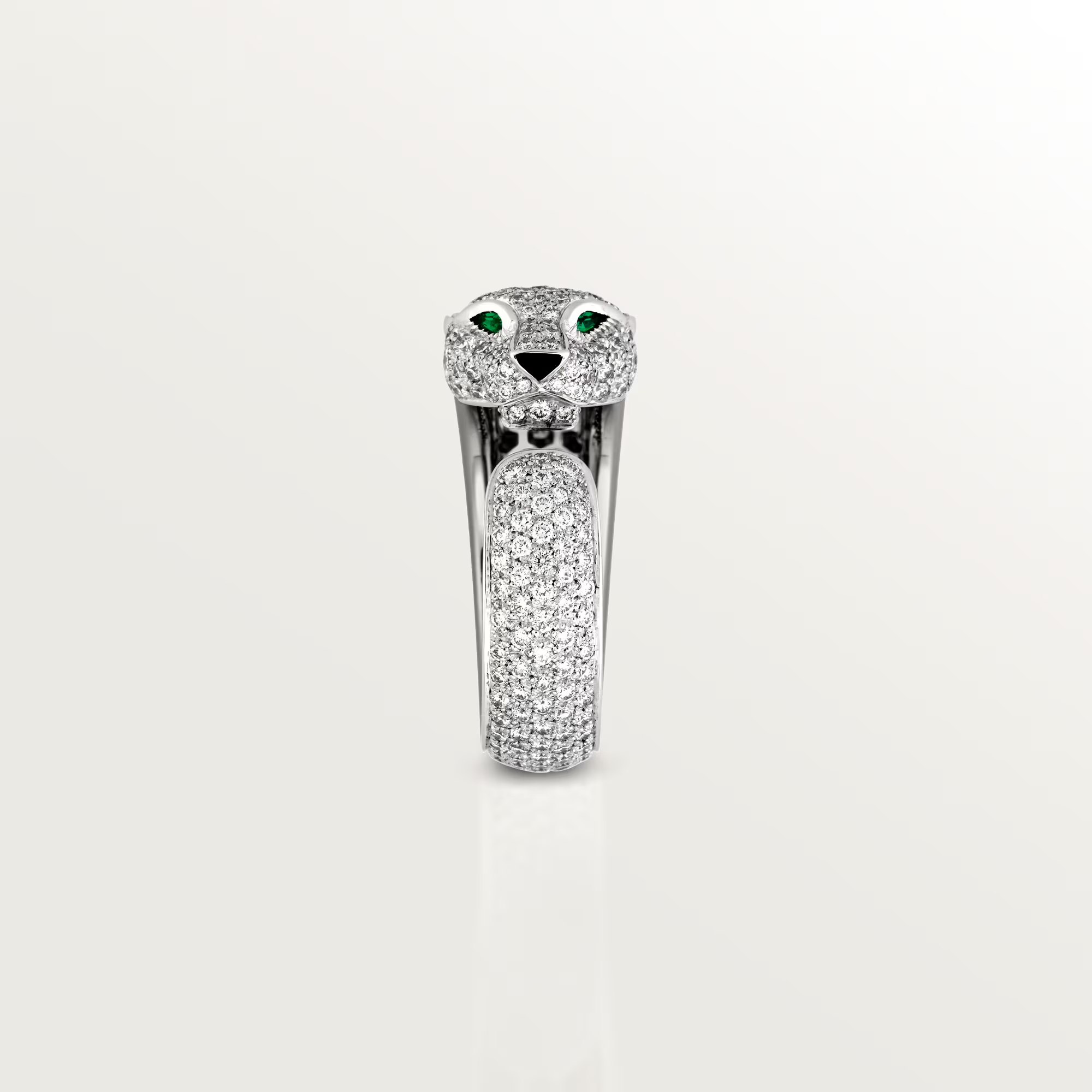A full pavé of brilliant-cut diamonds cloaks the ring in luminous sparkle, enhancing every curve with radiant intensity. The panther’s piercing details — from its powerful jawline to its elegantly shaped head — create a piece that feels both sculptural and fiercely feminine.