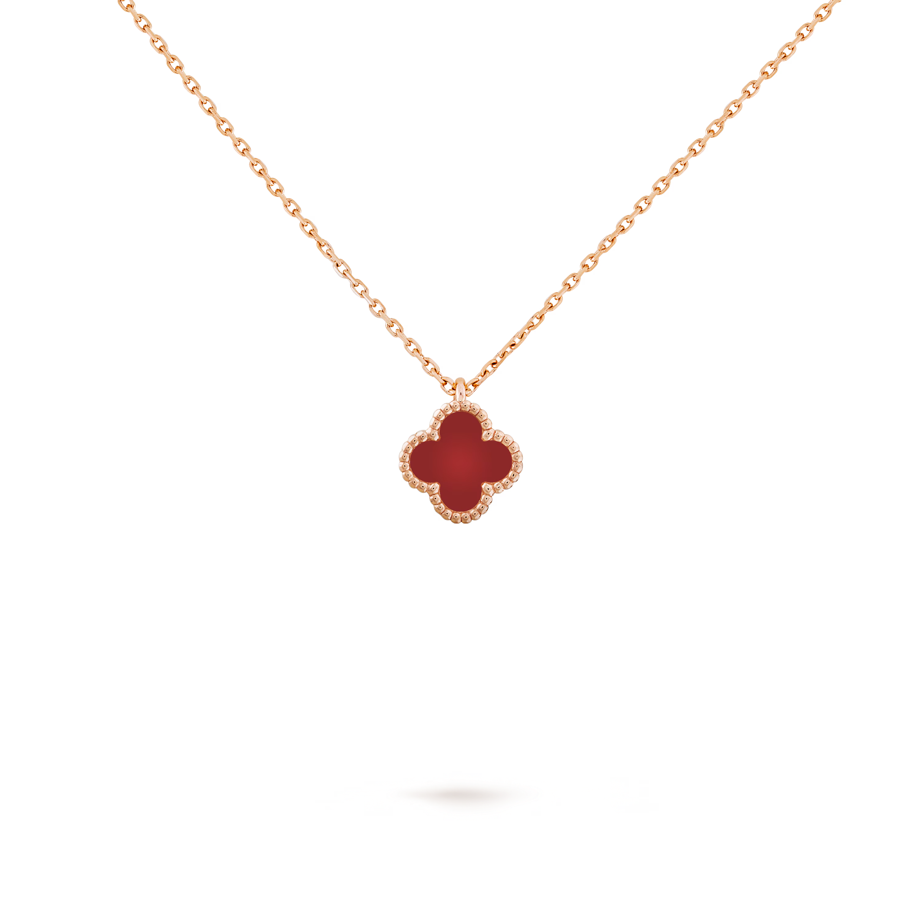 The rich, fiery red of the carnelian contrasts beautifully with the soft rose-gold frame, enhancing the pendant’s feminine elegance and subtle sophistication. The signature beaded gold contour highlights the delicate shape of the motif, while the radiant stone brings a burst of color, adding warmth and vitality to the design.