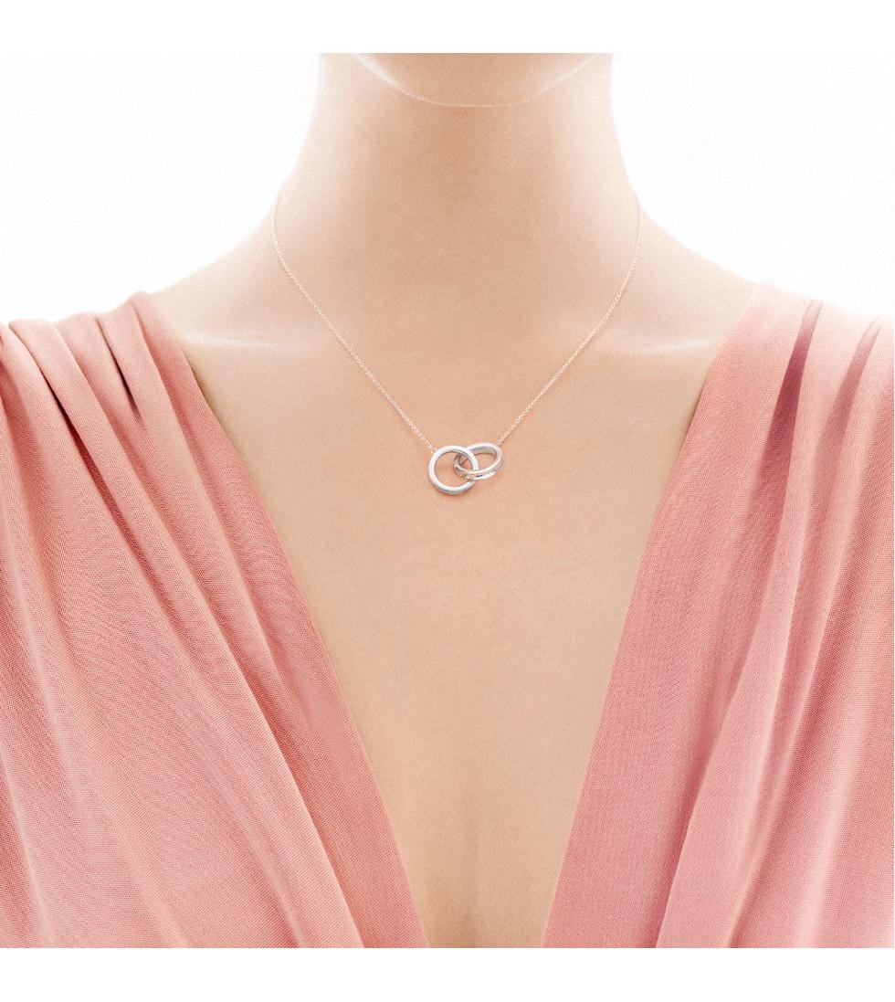 Suspended from a delicate chain, the intertwined circles rest gracefully along the neckline, creating a subtle yet meaningful statement. Its minimalist silhouette pairs effortlessly with any style, making it a cherished piece that can be worn for a lifetime.