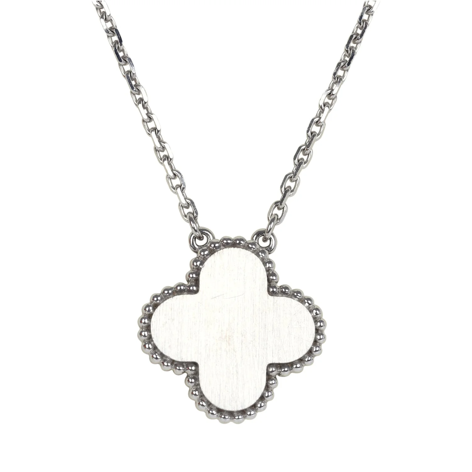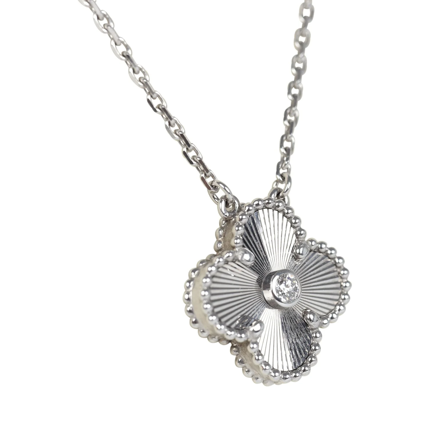 Van Cleef & Arpels 2020 Holiday Vintage Alhambra Pendant Necklace 18K White Gold Guilloche & Diamonds