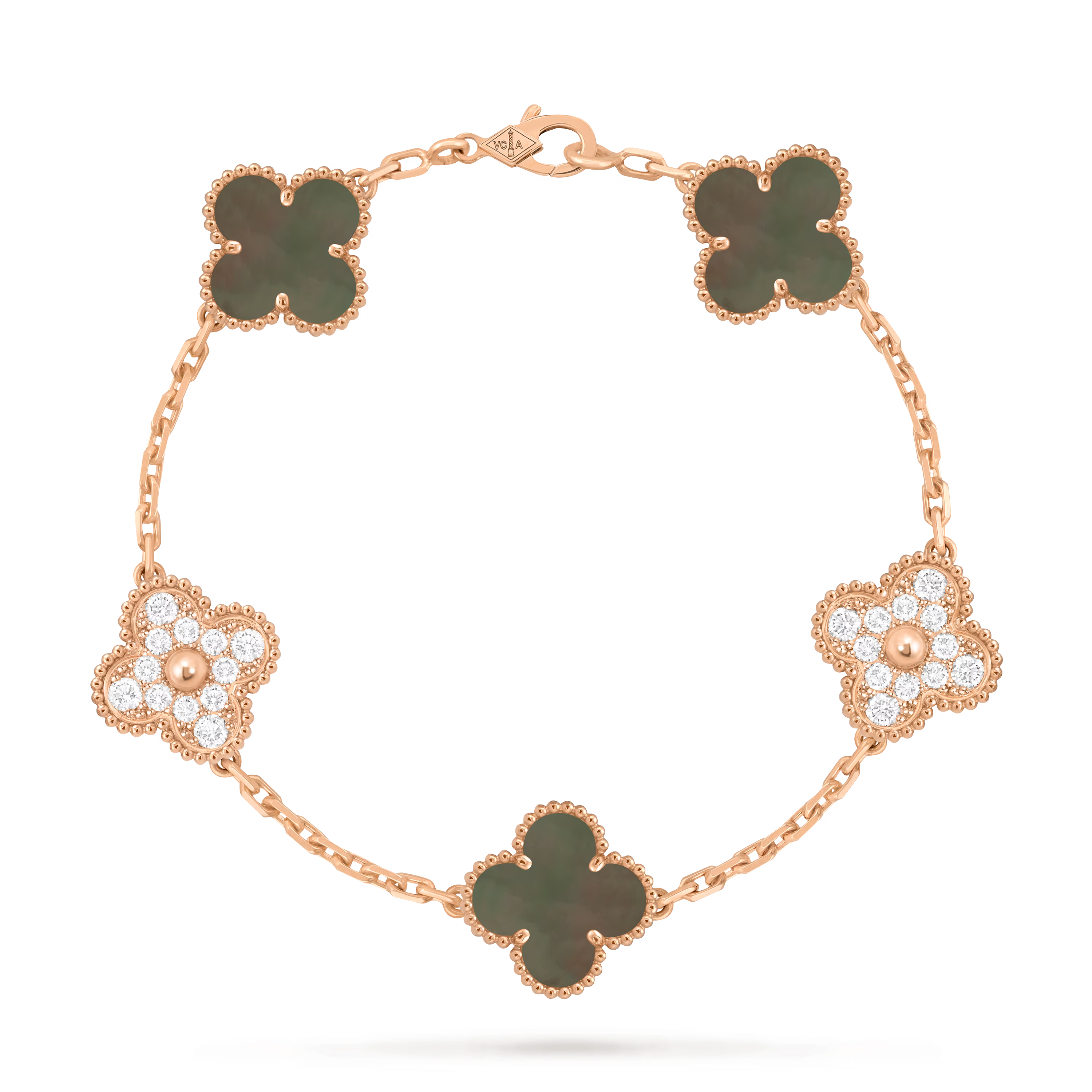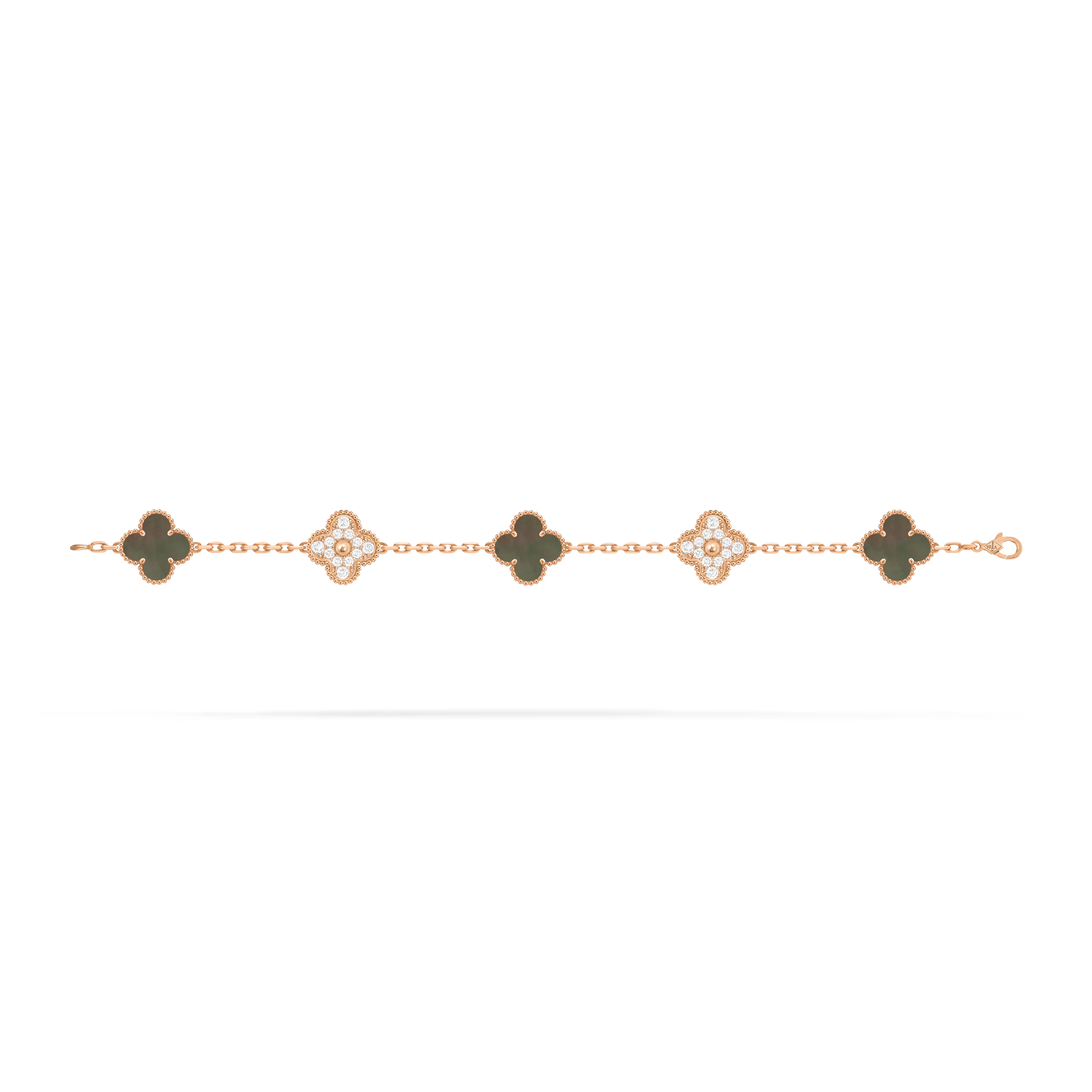 This bracelet features five Vintage Alhambra motifs, evenly spaced along the chain. The symmetrical layout creates a balanced and refined rhythm on the wrist, highlighting the purity and consistency of the original design.