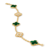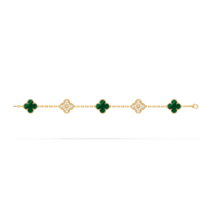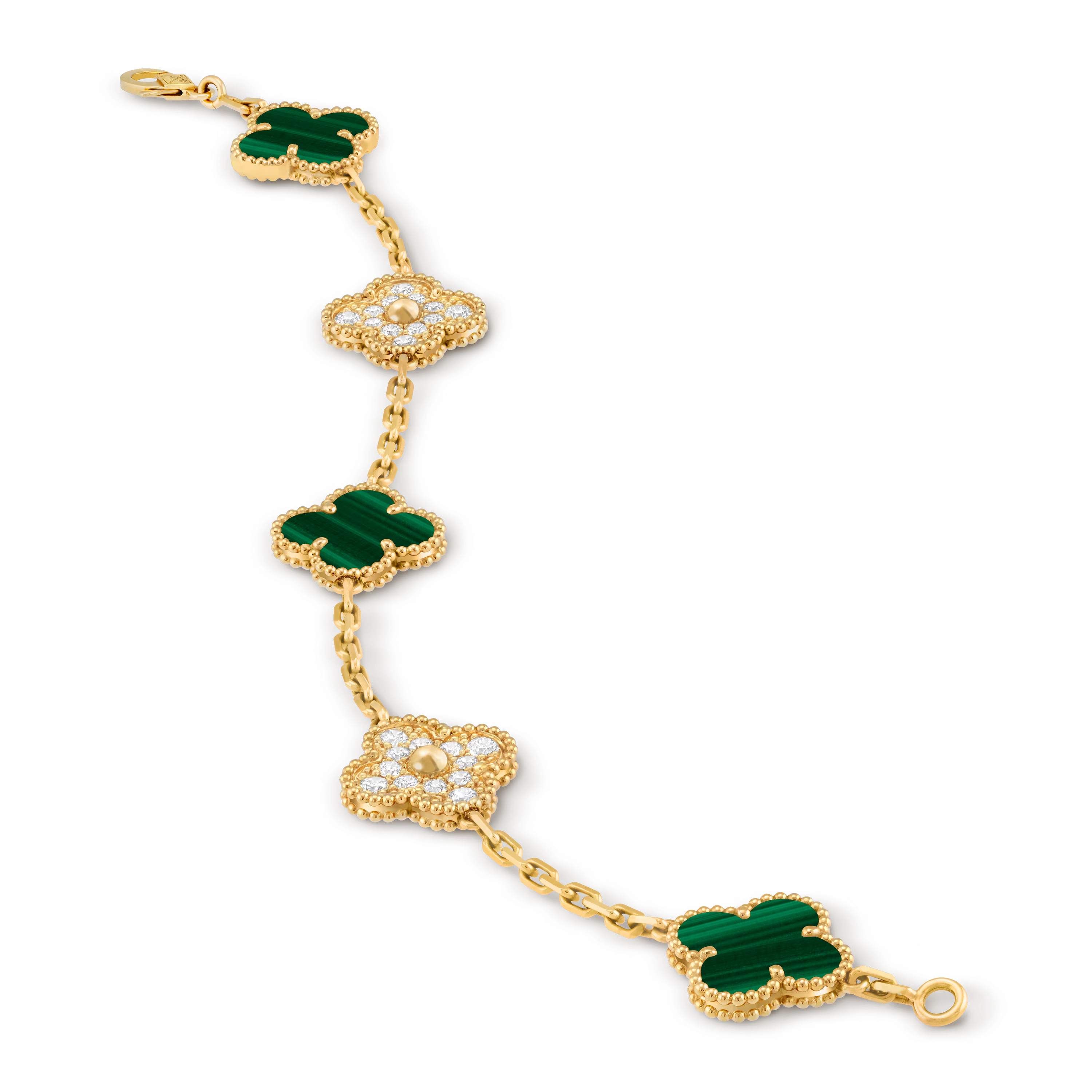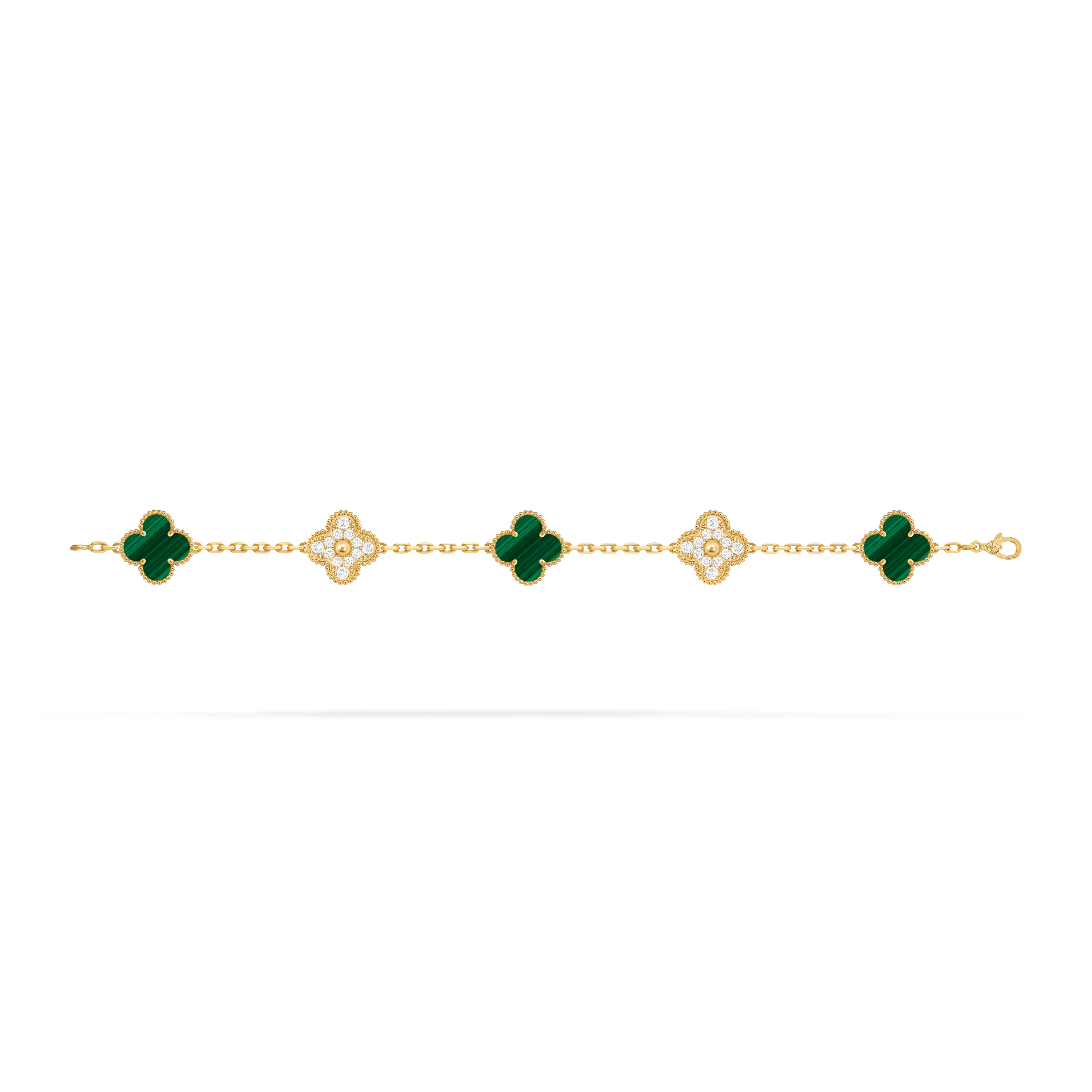 This bracelet is composed of five Vintage Alhambra motifs, evenly spaced along the chain. The symmetrical arrangement creates a refined rhythm on the wrist, reflecting the balance and timeless appeal of the original design.
