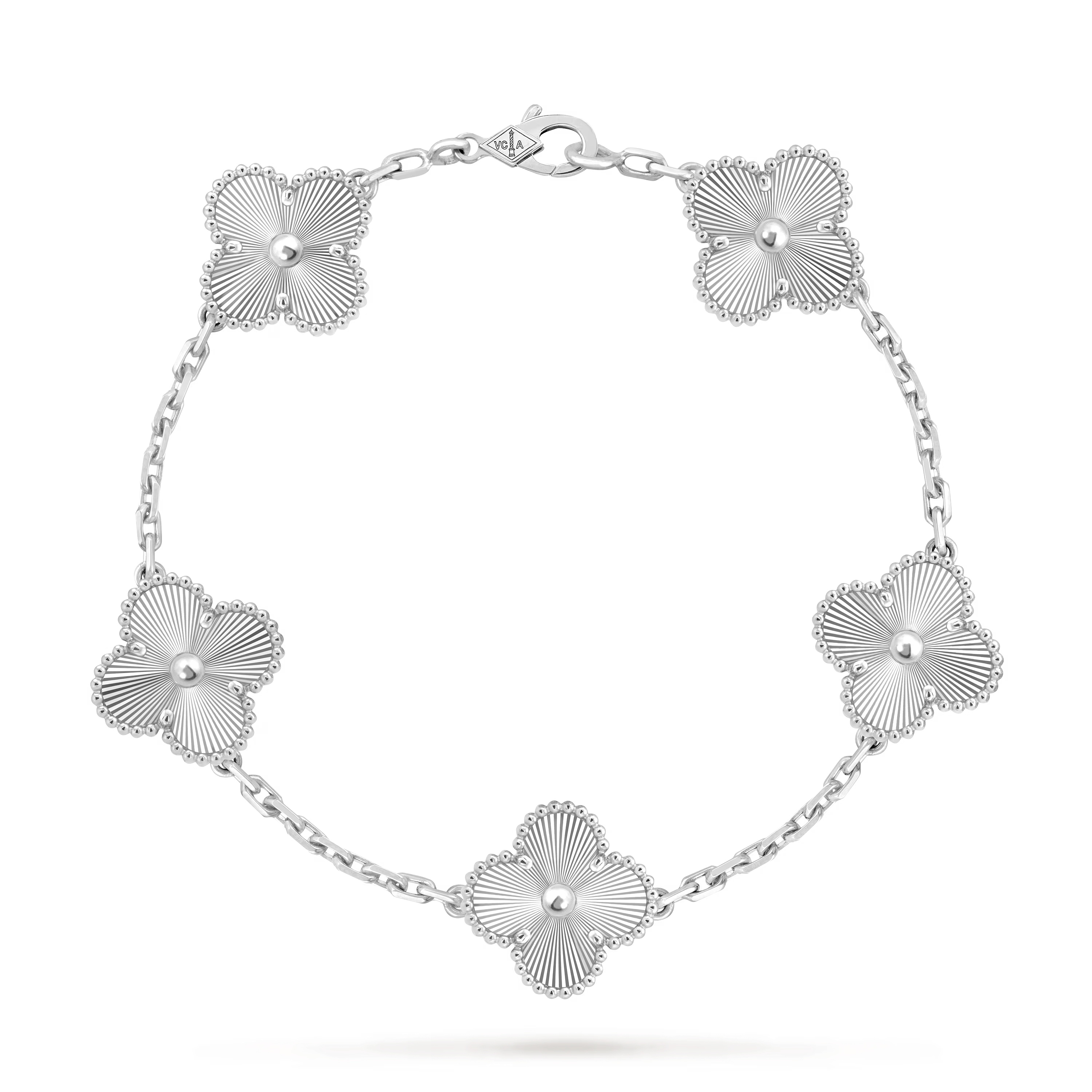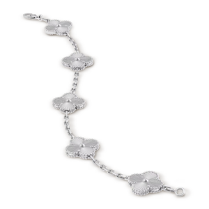 This bracelet features five Vintage Alhambra motifs, evenly spaced along the chain. The symmetrical arrangement creates a refined rhythm and balanced silhouette on the wrist, reflecting classic proportions and understated sophistication.