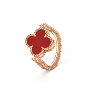 On one side, a radiant carnelian motif reveals its warm, velvety hue, symbolizing vitality and joy. Flip the design, and the ring transforms into a luminous treasure adorned with a brilliant diamond, offering a refined sparkle that captures light with every gesture. Both motifs are framed by the signature golden beaded contour, a hallmark of Van Cleef & Arpels’ craftsmanship.