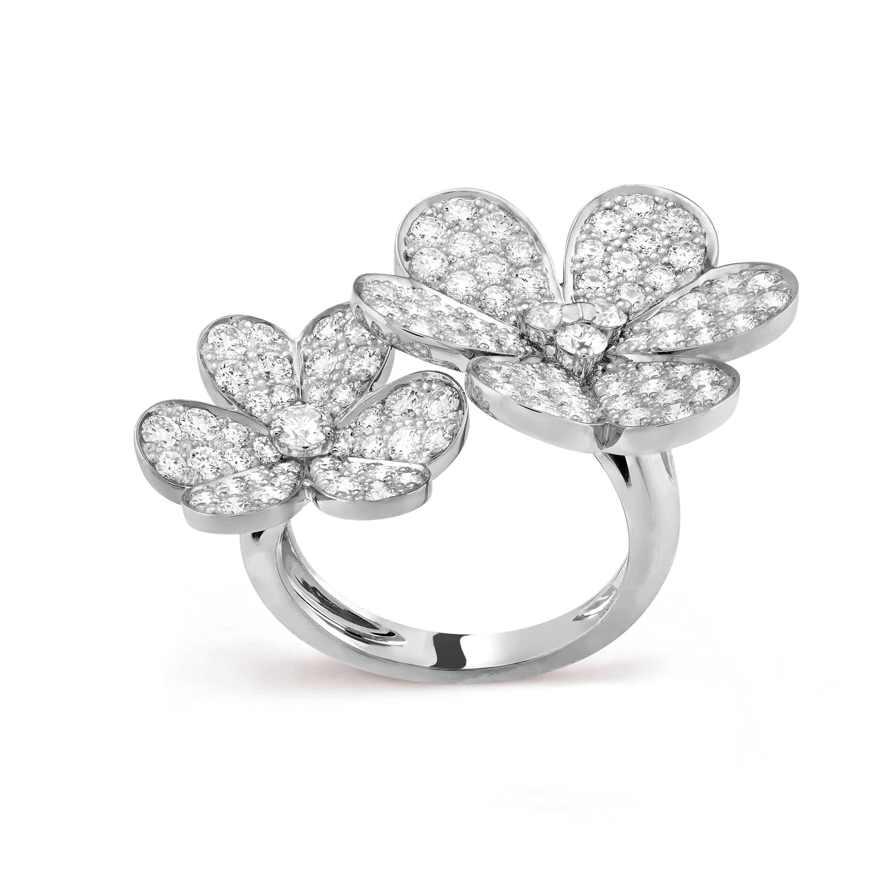 Crafted in 18K white gold, the ring features a beautifully sculpted Frivole flower motif, delicately set with brilliant diamonds at the heart of each petal. The contrast between the soft, polished gold and the sparkling diamonds creates a harmonious balance of light and texture. The between-the-finger design makes this ring a bold statement, yet its refined proportions ensure it remains elegant and wearable.
