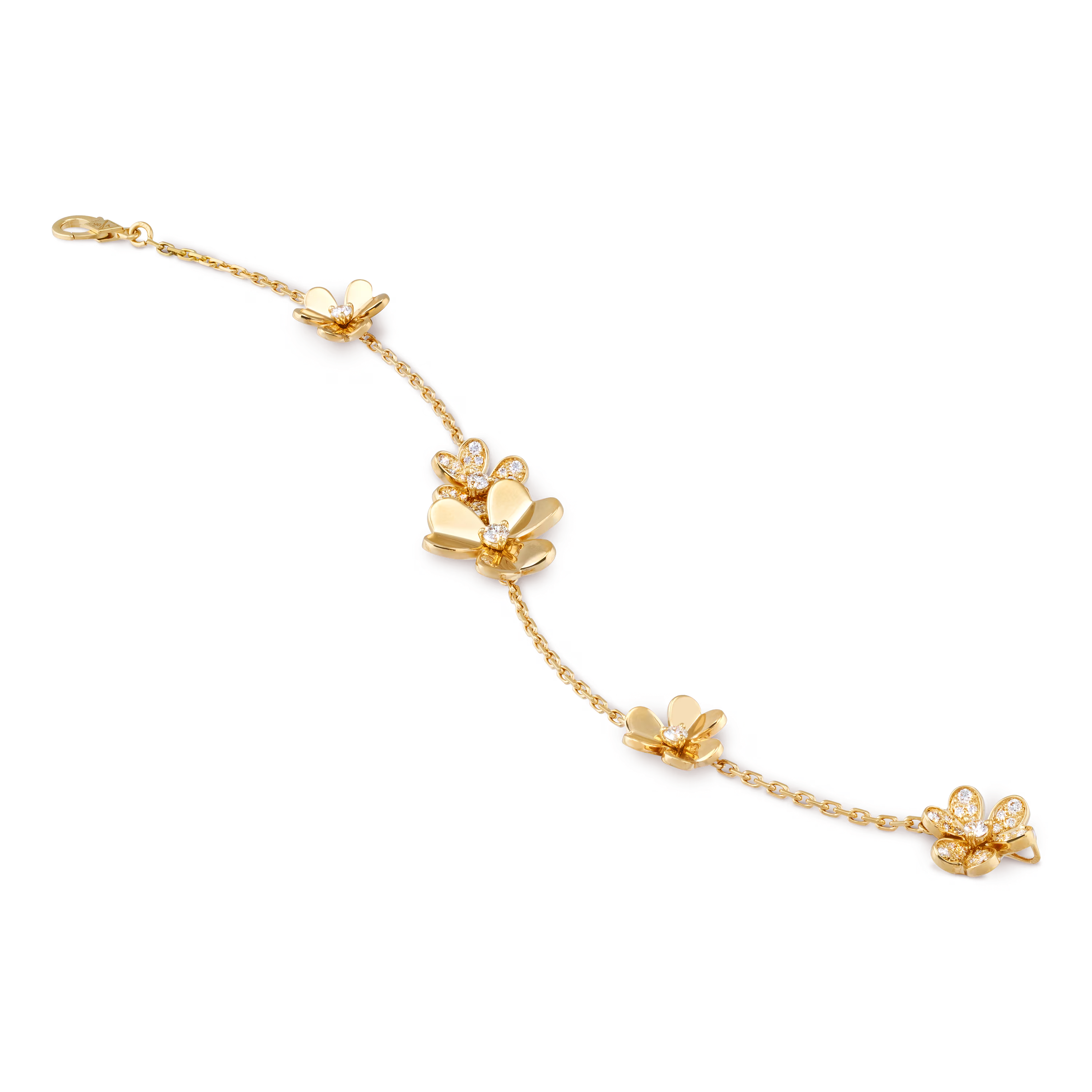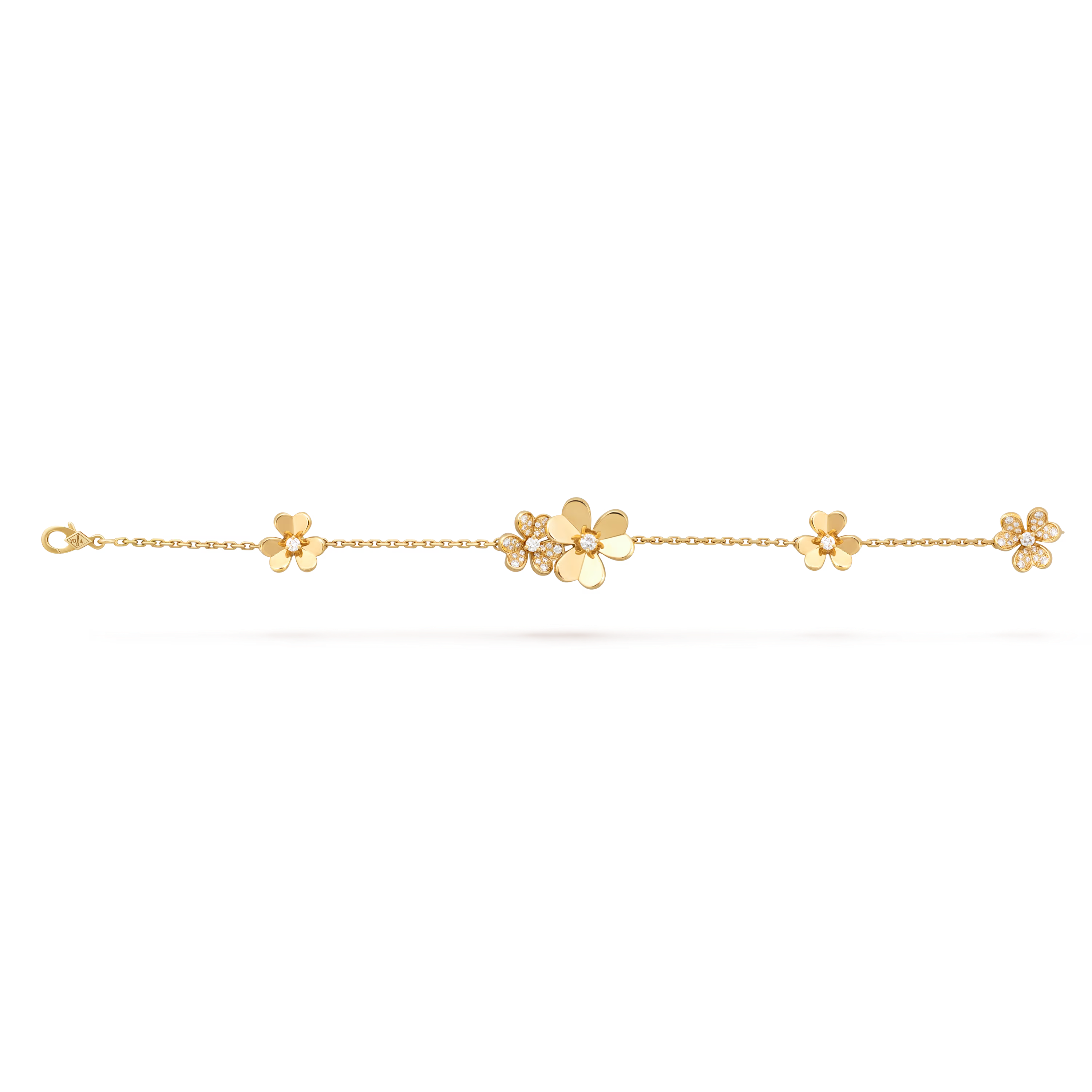 This bracelet features five Frivole flower motifs, delicately arranged along the chain. The balanced spacing creates a graceful rhythm on the wrist, offering a refined yet lively interpretation of floral design.