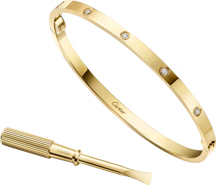The Cartier LOVE bracelet, small model, presents a delicate interpretation of the Maison’s iconic symbol of eternal love. Featuring the signature screw motif, the design is enhanced with 10 diamonds that add elegant sparkle while maintaining its sleek, minimalist character.• Diamonds