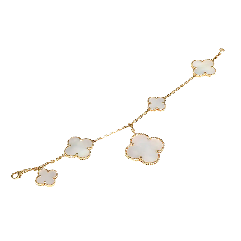 This bracelet features five Alhambra motifs in different sizes, arranged in a graceful sequence that breaks traditional symmetry. The varying scales lend the piece depth and fluidity, creating a refined yet expressive silhouette.