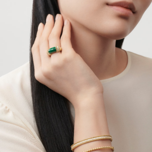 In its medium size, the bracelet achieves the perfect balance between understated refinement and visible radiance. Its smooth curvature gently embraces the wrist, offering a comfortable fit suitable for daily elegance or evening refinement.