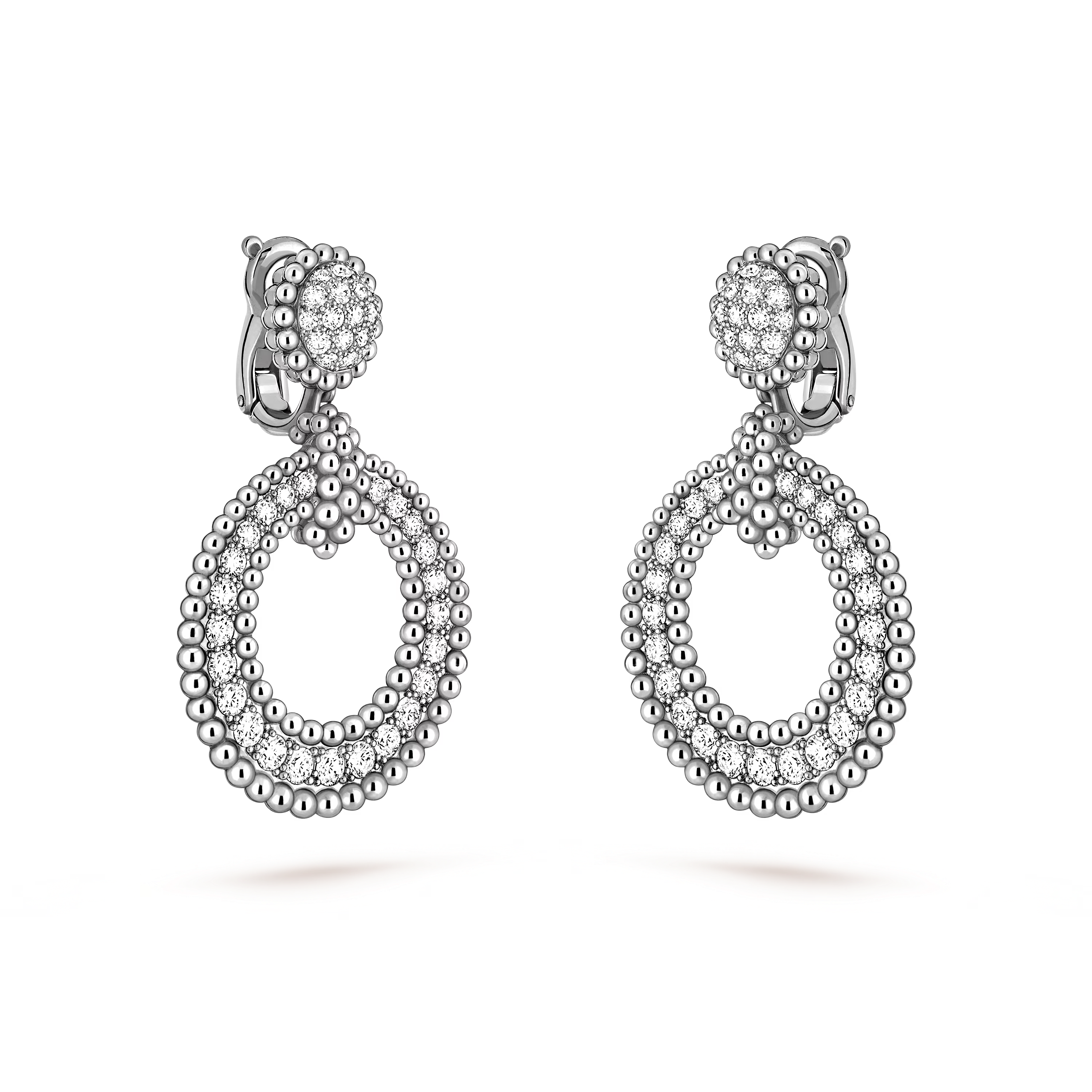 Each earring is crafted in 18K gold and adorned with a row of carefully selected brilliant-cut diamonds, meticulously set to enhance their sparkle and depth. The iconic beaded contour adds tactile elegance and a subtle shimmer, highlighting Van Cleef & Arpels’ dedication to artisanal perfection.
