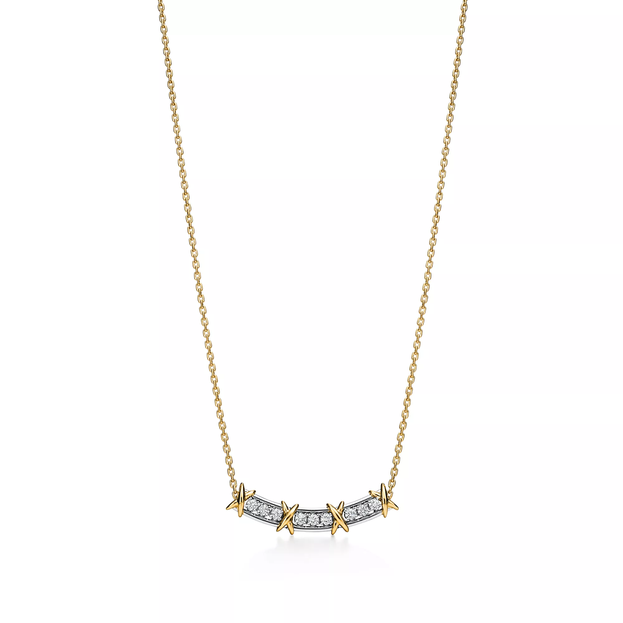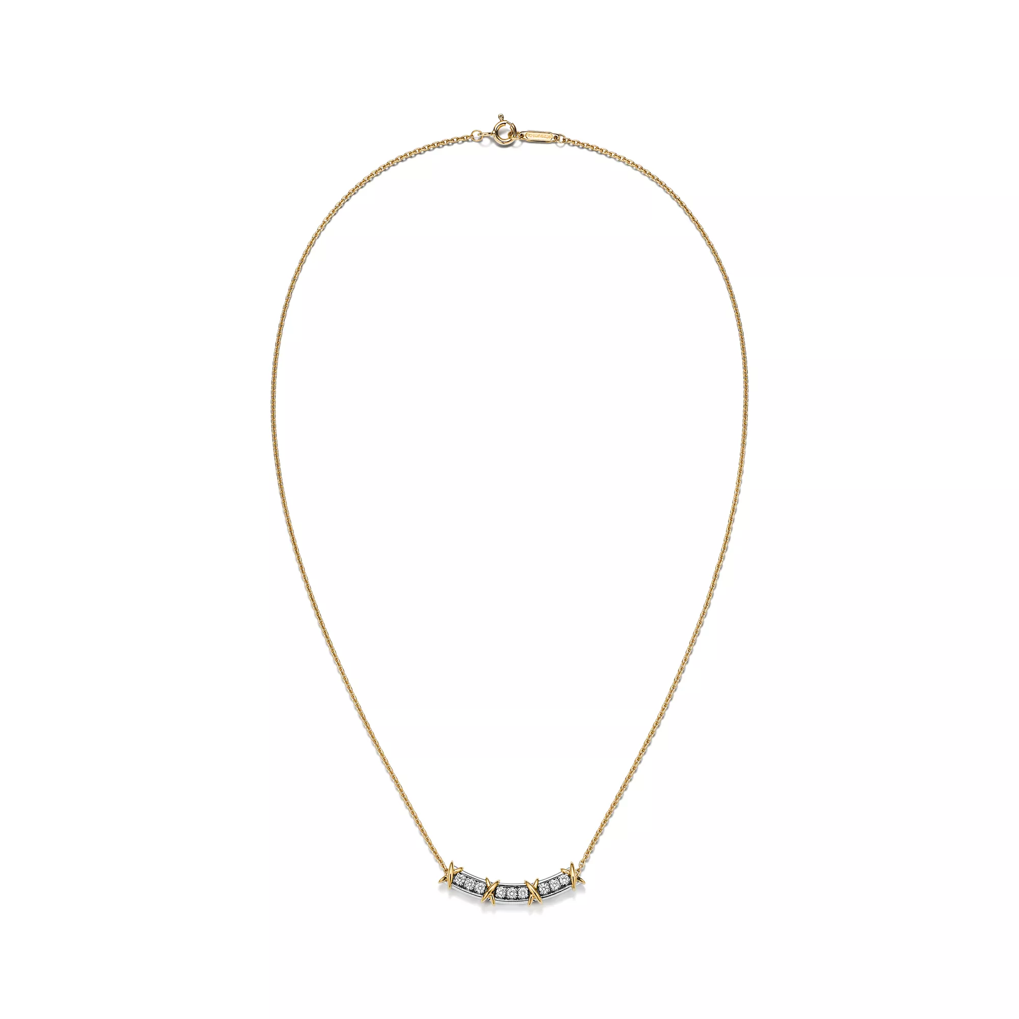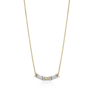 A masterpiece of contrast, craftsmanship, and modern elegance — the Sixteen Stone by Tiffany Narrow Pendant brings together the radiance of yellow gold, the cool sophistication of platinum, and the fiery brilliance of diamonds in a sleek, linear silhouette.