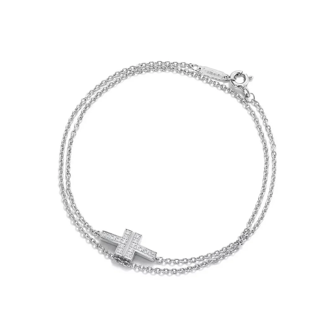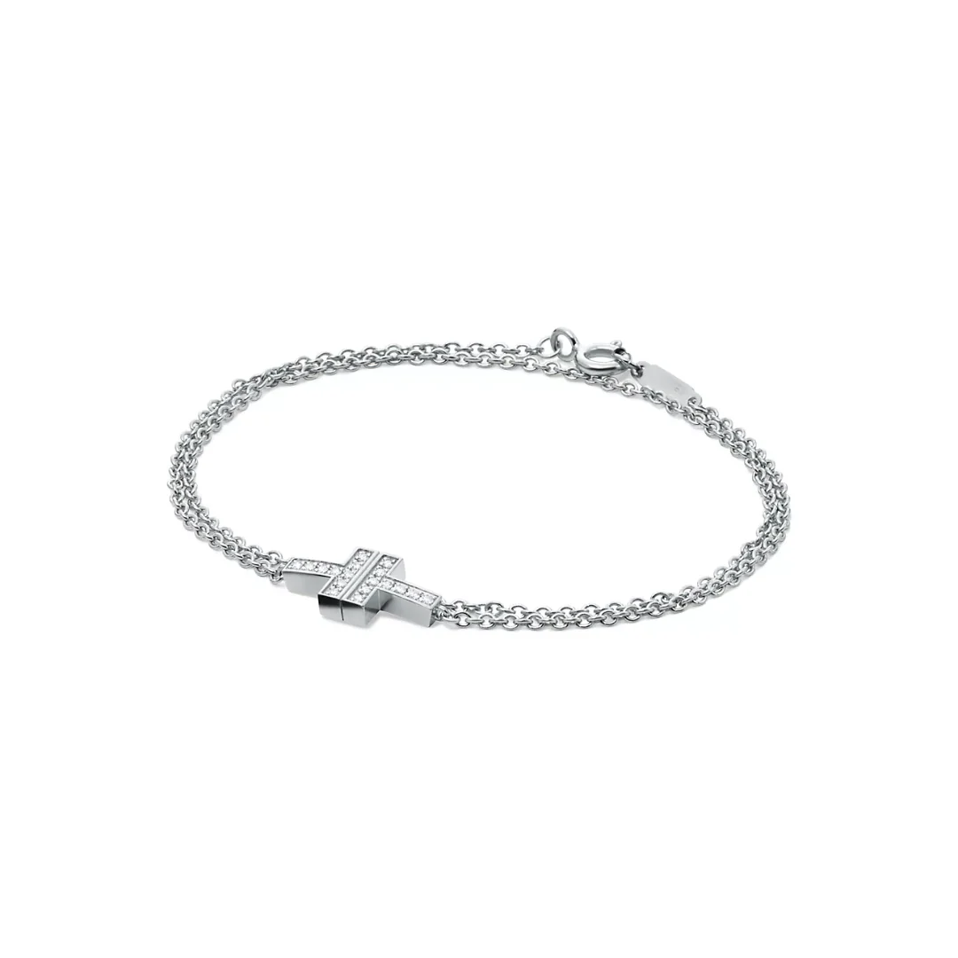A refined expression of the iconic Tiffany T motif, this Diamond Double Chain Bracelet brings modern elegance to any look. The sleek T-shaped element is set with sparkling diamonds and paired with a delicate double-chain design that adds subtle dimension and sophistication.
