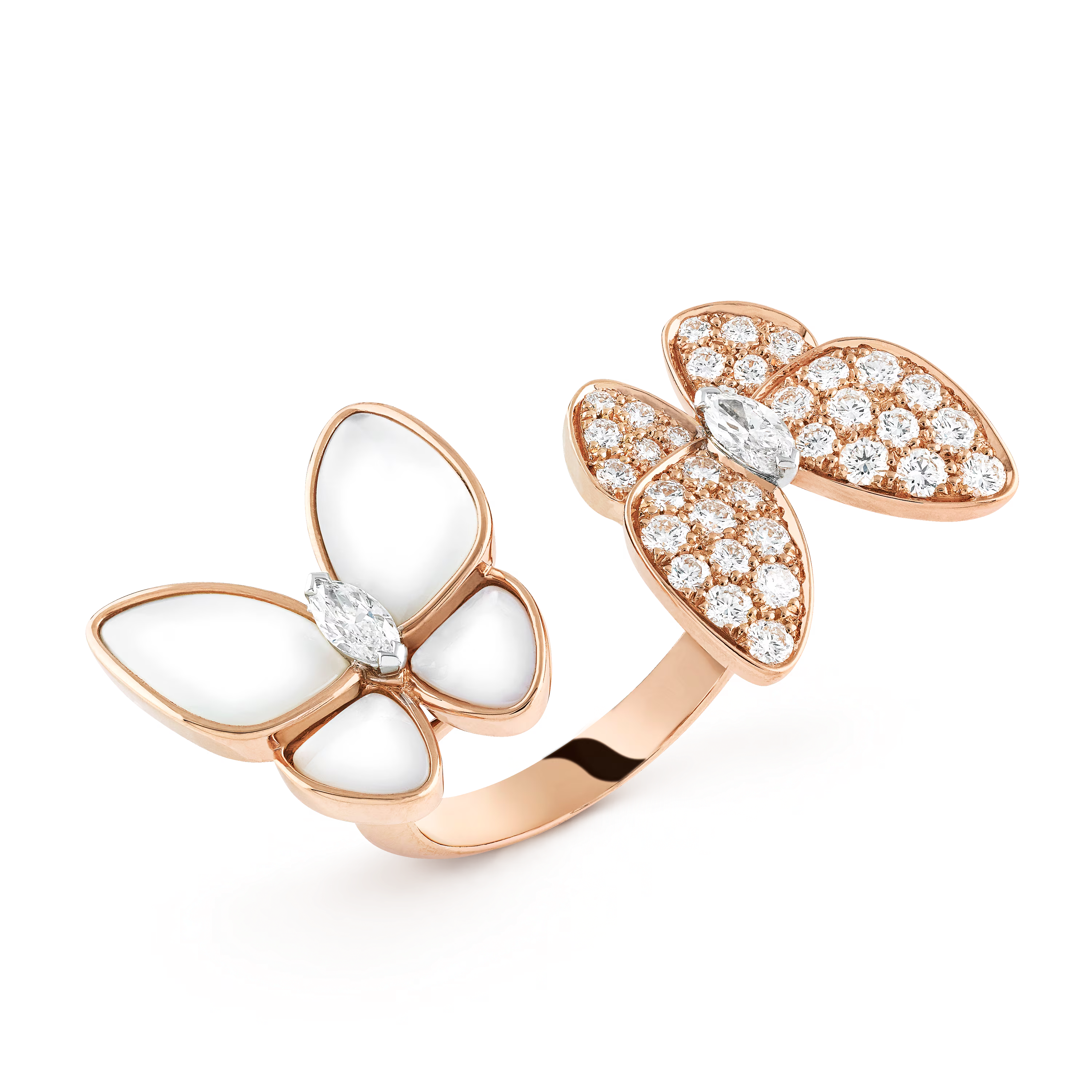 One butterfly is sculpted in glowing mother-of-pearl, revealing soft, iridescent reflections that shift with every gesture. Its counterpart sparkles with brilliant diamonds, each carefully selected and set to enhance the creature’s ethereal silhouette. Together, they appear to take flight across the hand, creating the iconic Between the Finger effect—an artistic signature of the Maison.
