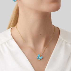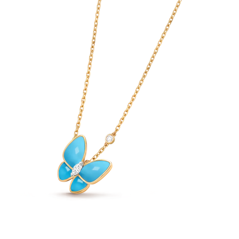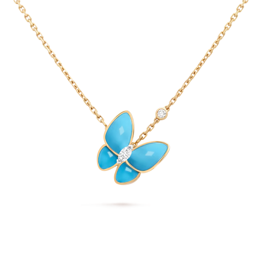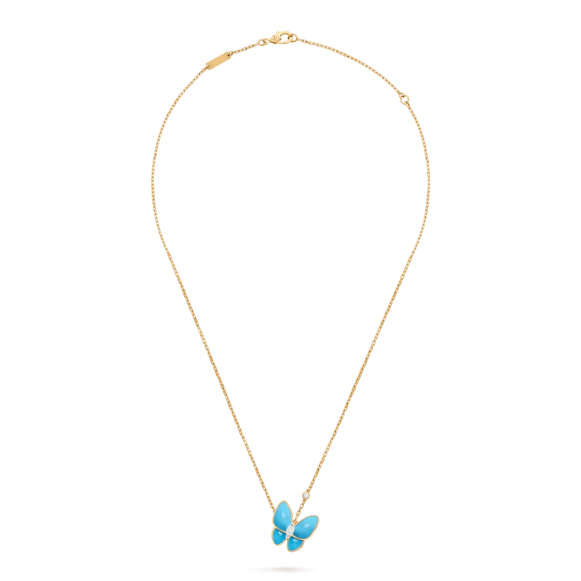 The Van Cleef & Arpels Two Butterfly Pendant Necklace features a delicate design with two intricately crafted butterflies, symbolizing grace, freedom, and harmony. Made from 18K gold, this pendant demonstrates the Maison’s renowned craftsmanship and elegant aesthetic.