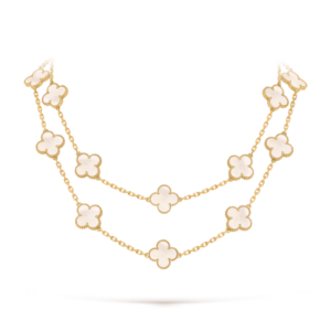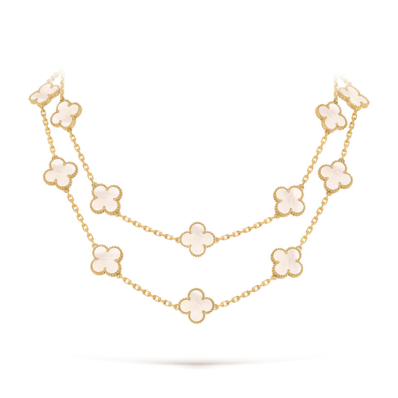 The Vintage Alhambra long necklace showcases twenty iconic clover motifs symbolizing luck and timeless elegance. Each motif is crafted from natural materials and framed by delicate beaded 18K gold edges, creating a harmonious and recognizable silhouette.