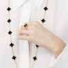 The Vintage Alhambra long necklace features twenty iconic four-leaf clover motifs, each symbolizing luck and timeless elegance. Crafted with carefully selected natural materials and framed by delicate beaded edges, this necklace embodies the refined charm and signature style of the Vintage Alhambra collection.