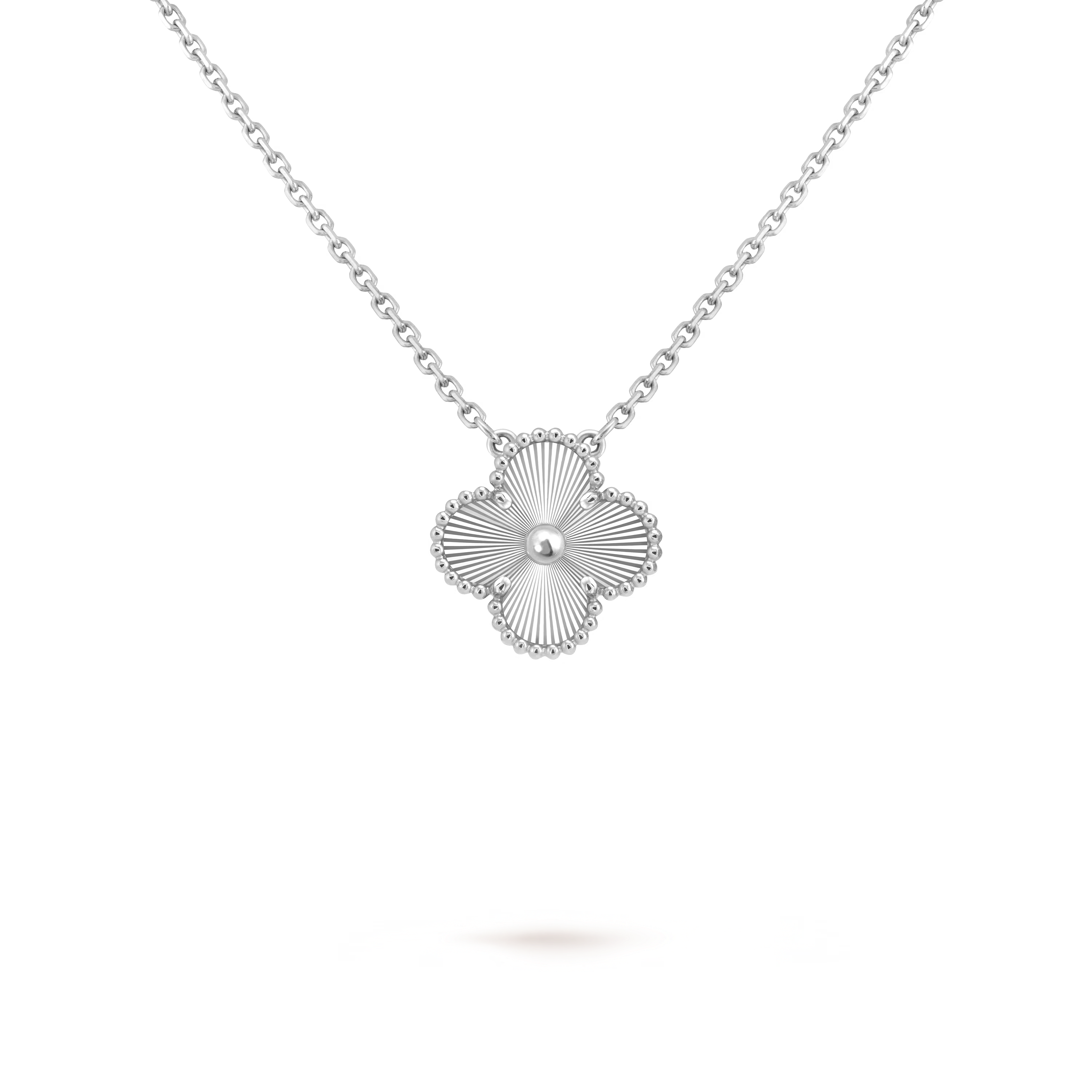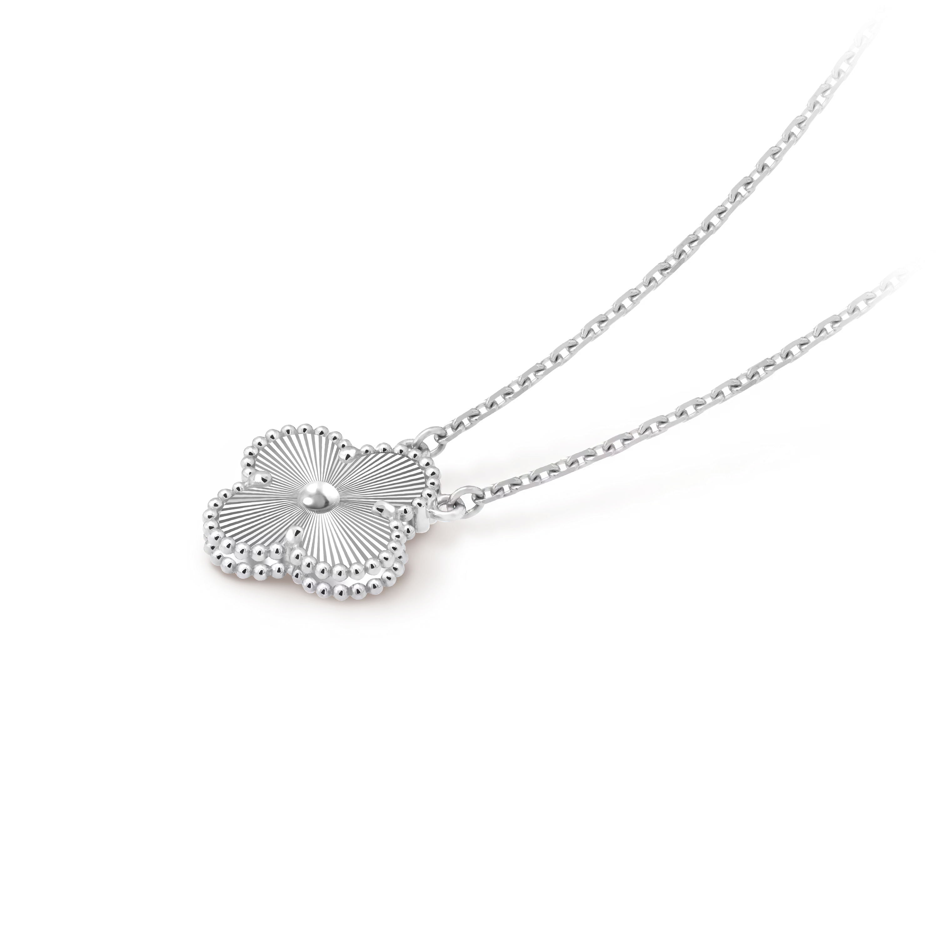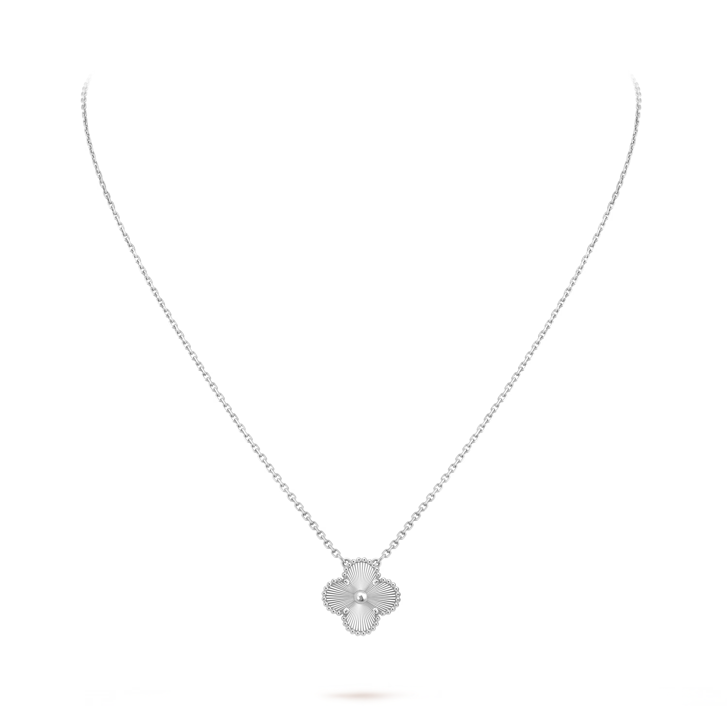 Crafted entirely in luminous 18K white gold, the motif reveals a cool, silvery sheen that enhances its refined silhouette. The signature beaded contour—delicately shaped and polished by hand—adds subtle dimension, catching the light with every movement. Its understated brilliance makes this pendant a versatile treasure, equally suited for daily wear or sophisticated occasions.